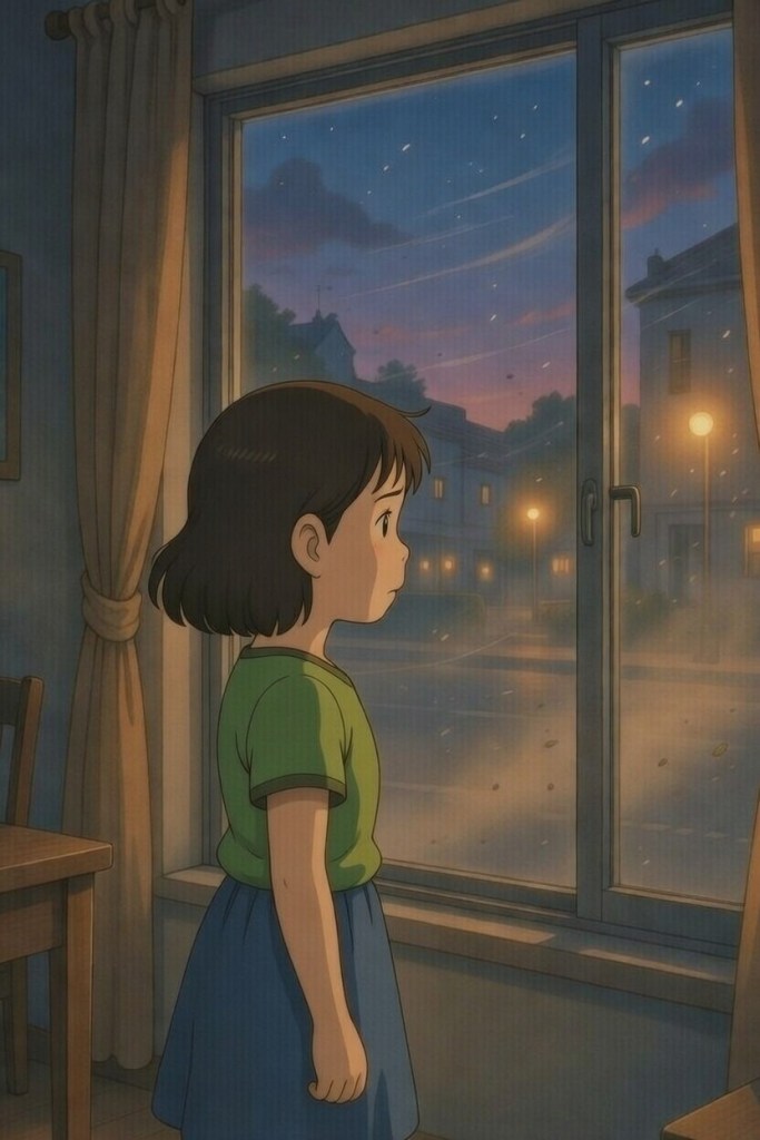 Holding her father’s hand tightly, she crossed the road. She jumped over puddles, occasionally closing her eyes and only opening them slightly to see where she was going.