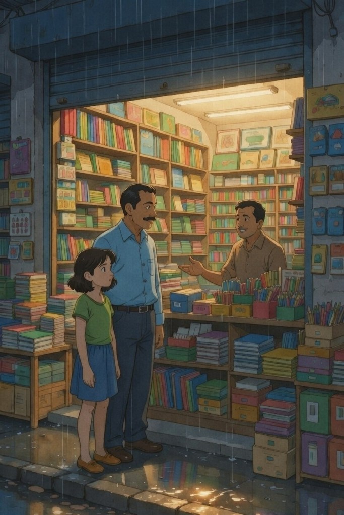 She thoroughly enjoyed the trip. She saw it as an adventure, an important ritual with her father. Walking into the stationery store where books, pencils, pens, erasers, watercolors, pencil stands, single-line notebooks and double-line notebooks were stacked neatly across multiple shelves gave her a strange sense of comfort, almost like home.